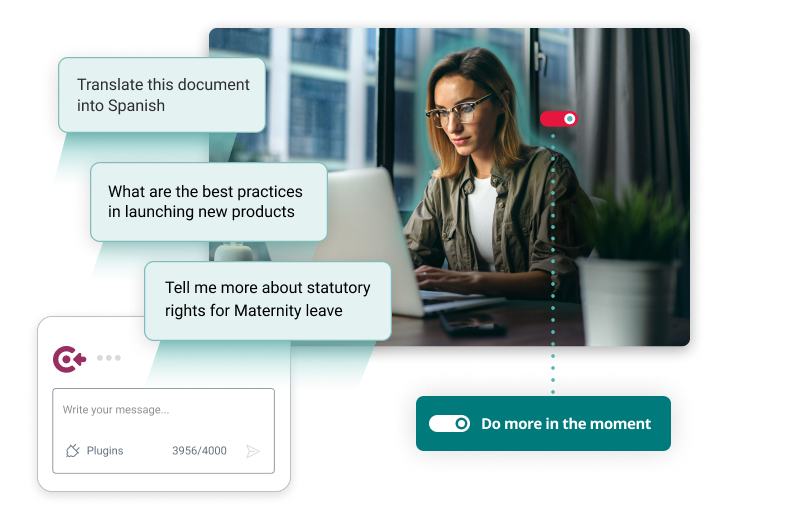 Document Skills (plug-in) will instantly find HR facts from any company policy, process or information documentation. Employee Data Skills (plug-in) will instantly retrieve personal, team or company data relative to individual roles and privacy permissions without navigating multiple menus or interfaces