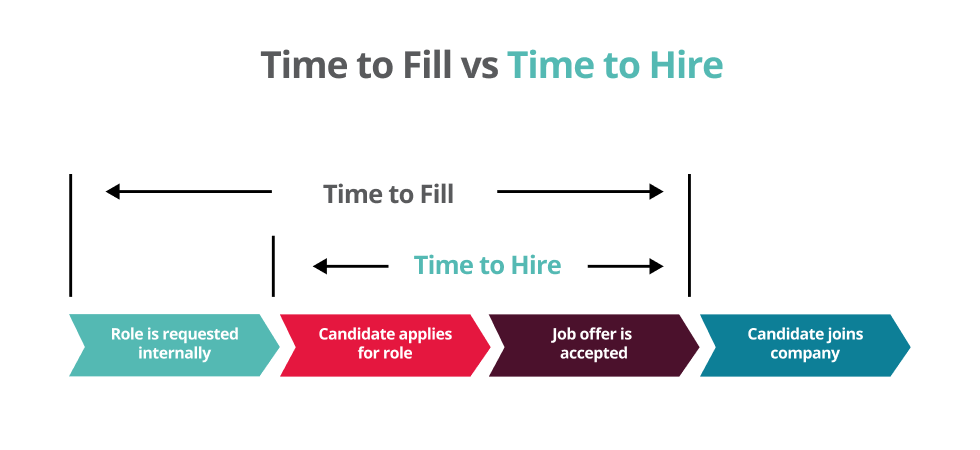 Time to hire and time to fill are both important metrics for HR teams working with recruitment and looking to improve your efficiencies. Time to hire looks at the time it takes from a candidate applying to a role to when they accept the job offer. Time to fill covers the entire hiring process, from when a job posting is requested to when it is filled.